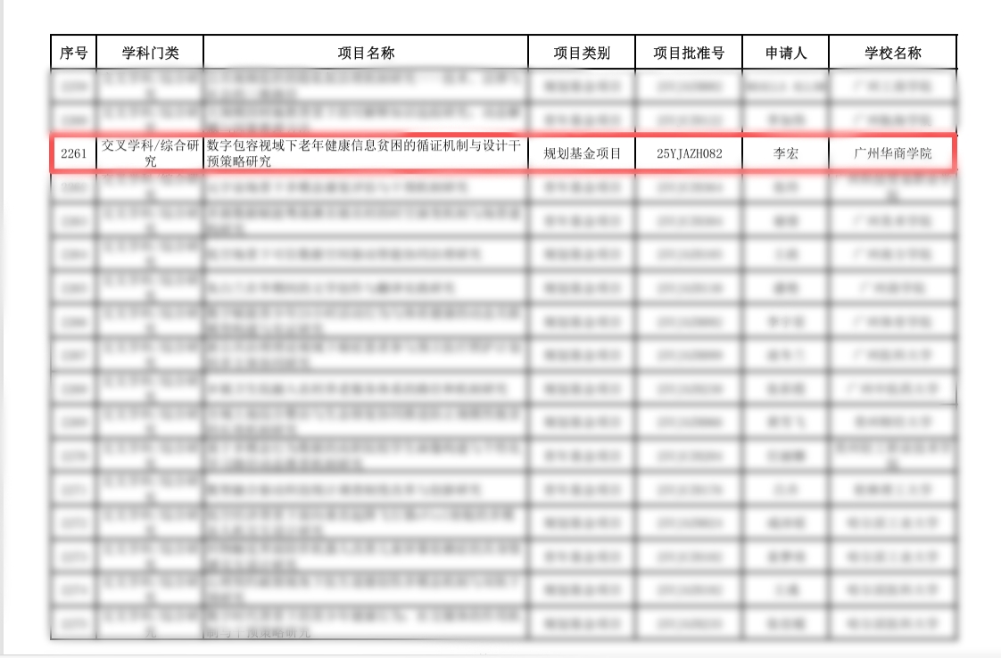 近日,粤港澳大湾区智慧健康养老产业研究中心李宏教授主持的《数字包容视域下老年健康信息贫困的循证机制与设计干预策略研究》项目获教育部2025年度人文社会科学研究一般项目立项。