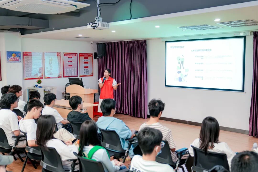 活动伊始,永宁街综合养老服务中心与新塘镇综合养老服务中心的工作人员对师生团队的到来表示热烈欢迎,并围绕机构运营模式、服务特色展开系统介绍。工作人员重点阐述了两大中心的核心定位:永宁街综合养老服务中心以居家养老为核心,整合助餐配餐、医养结合、精神慰藉等多元服务;新塘镇综合养老服务中心作为省级星级机构,在院舍照顾领域形成专业标杆,创下多项行业佳绩。
