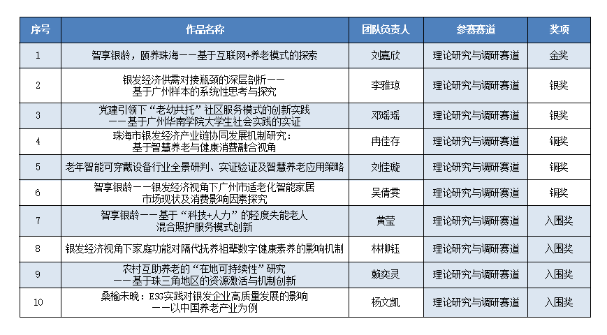 根据专家评委的评审结果,银发经济创意创业大赛理论研究与调研赛道决赛获奖情况如下: