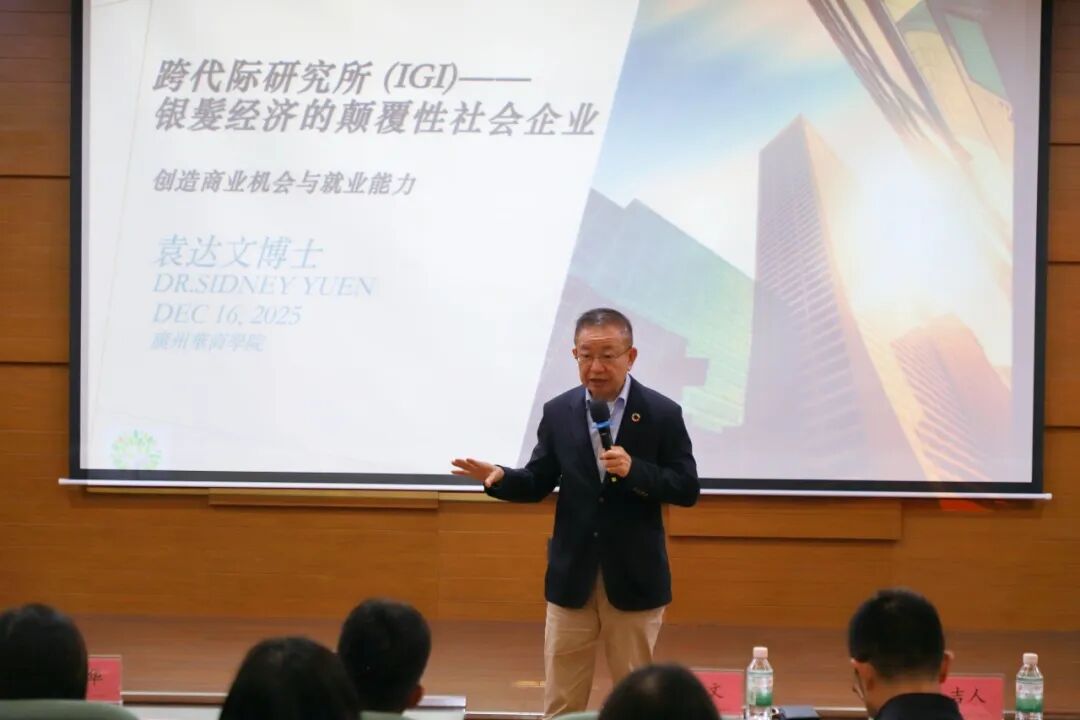 讲座中,袁达文博士深入分析了全球人口老龄化进程加速与我国具体国情相交织背景下,“银发经济”所展现的重大发展潜力与深远社会价值。他系统阐释了“跨代际创新”理念,明确指出当前我国社会正面临的结构性供需错位:一方面是大量处于50至55岁较早退休阶段的“活力长者”,仍保有充沛精力、丰富经验与继续贡献社会的强烈意愿,其经验智慧资源尚未得到充分开发利用;另一方面则是广大“热情青年”,虽普遍掌握现代技术、富有创新精神,却在职业发展、资源整合与实践能力提升方面迫切需要有效指导。这种代际间的隔阂与资源错配现象,恰恰为促进代际协作、推动社会创新提供了宝贵的机遇与空间。