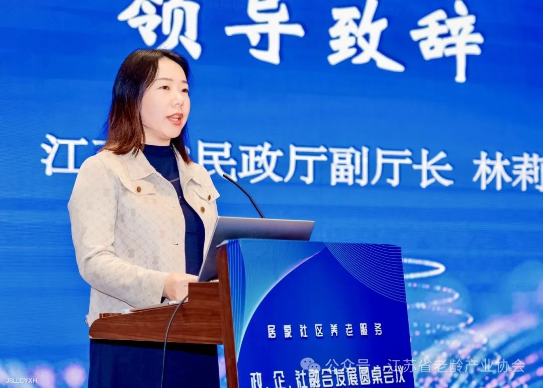 省民政厅副厅长林莉致辞。她首先代表省民政厅,对第四届老交会的成功举办和研究院的成立表达了热烈的祝贺,并对所有长期关心并支持江苏康养事业发展的朋友们,致以了衷心的感谢。她强调,老龄工作和养老服务发展任重道远,需要政府、企业、社会多方面协同发力。她期望,与会者能够充分利用本次圆桌会议的契机,加强交流、增进共识、深化合作,共同为江苏省乃至长三角地区康养产业的繁荣发展贡献智慧和力量。