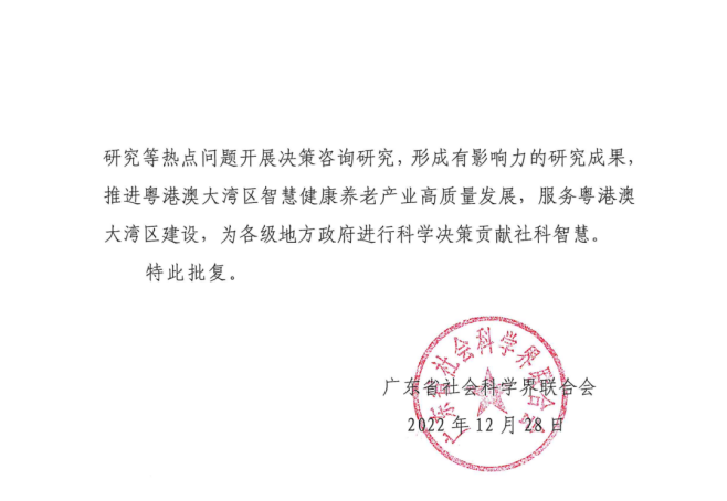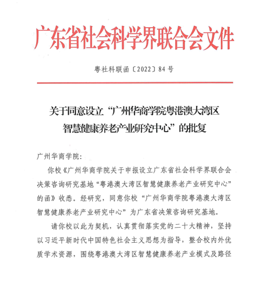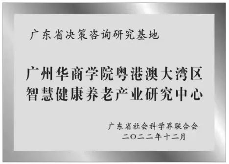 为深入贯彻落实国家“健康中国”战略,因应《广东省养老服务体系建设“十四五”规划》明确提出的推动智慧健康养老产业创新发展要求,推进学校在智慧健康养老产业领域的科学研究和人才培养规划,经前期组织材料申报,广东省社会科学界联合会组织专家审研,2022年12月28日,广州华商学院粤港澳大湾区智慧健康养老产业研究中心获批广东省决策咨询研究基地,并获授牌。